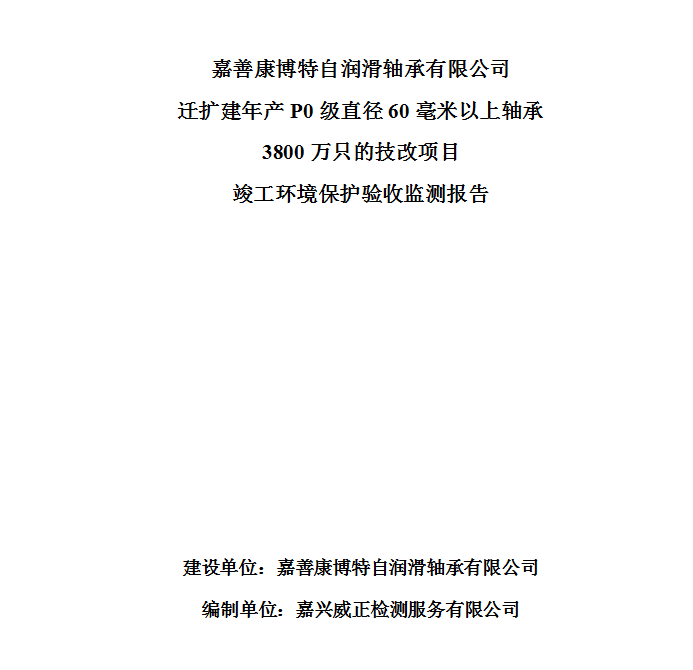 ?嘉善康博特自潤滑軸承有限公司遷擴建年產(chǎn)P0級直徑60毫米以上軸承3800萬只的技改項目竣工環(huán)境保護驗收監(jiān)測報告????????建設(shè)單位:嘉善康博特自潤滑軸承有限公司編制單位:嘉興威正檢測服務(wù)有限公司?